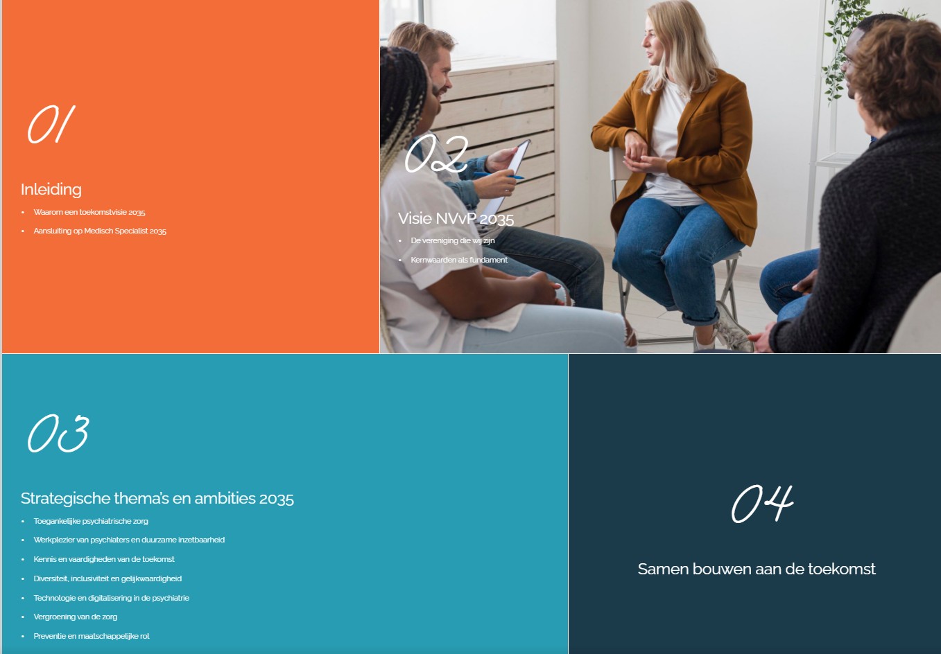 De toekomst van de psychiatrie vraagt om visie, samenwerking en moed. Met de visie 2035 zet de NVvP koers naar toegankelijke, vakkundige, en duurzame psychiatrische zorg. De komende jaren zijn bepalend. De uitdagingen in de geestelijke gezondheidszorg vragen om een gezamenlijke en multidisciplinaire inzet van psychiaters en andere zorgverleners, patiënten en naasten, beleidsmakers en andere stakeholders in zorg en samenleving. De NVvP biedt richting door duidelijke ambities en ruimte door samenwerking en vertrouwen.